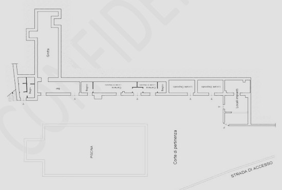 Le ampie aree esterne valorizzano ulteriormente la proprietà, includendo parcheggi, percorsi pedonali e carrabili, terrazzi panoramici, la corte interna pavimentata e la piscina, perfettamente integrata nel contesto architettonico. A completare il complesso, la tenuta si estende su circa 70 ettari di terreno, offrendo un'oasi di esclusività e prestigio immersa nella storia e nella natura.