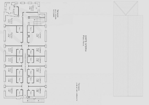 Il secondo piano, esteso per circa 490 mq nella porzione Sud/Est, ospita ulteriori 13 camere, anch'esse suddivise tra doppie e superior, garantendo agli ospiti un soggiorno in totale comfort. Un vano murario conduce a una scala esterna in ferro, che permette l'accesso al terrazzo panoramico sottostante, un angolo di relax immerso in un contesto paesaggistico di rara bellezza.